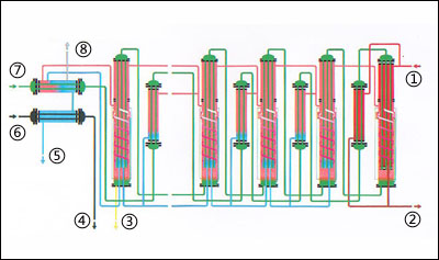 原料水在一效預(yù)熱器被工業(yè)蒸汽加熱,進(jìn)入后面各效預(yù)熱器被二次蒸汽繼續(xù)加熱;到冷凝器被二次蒸汽、蒸餾水加熱;然后在蒸發(fā)器頂部經(jīng)分水裝置,均勻地分布進(jìn)入蒸發(fā)列管,在蒸發(fā)列管內(nèi)形成薄膜狀的水流;這些水流因為薄所以很快被蒸發(fā),產(chǎn)生二次蒸汽;未被蒸發(fā)的原料水被輸送到下一效,作為次效蒸發(fā)器的原料水,以后各效與此類似,未被蒸發(fā)的進(jìn)入下一效,直到最后一效仍未被蒸發(fā)的,將作為凝結(jié)水排放;被蒸發(fā)的原料水,現(xiàn)在是二次蒸汽,繼續(xù)在蒸發(fā)器中盤旋上升,經(jīng)中上部特殊分離裝置處,進(jìn)入純蒸汽管路,作為次效的熱源;二次蒸汽在次效被吸收熱量后凝結(jié)成蒸餾水;各效過程與此相似,各效的蒸餾水和末效的二次蒸汽被冷凝器收集,并經(jīng)過與冷卻水、原料水換熱,冷卻成為蒸餾水;經(jīng)過電導(dǎo)率的在線檢測,合格的蒸餾水作為注射用水輸出,不合格的蒸餾水將被排放。 原料水轉(zhuǎn)化成的二次蒸汽是潔凈蒸汽,它經(jīng)過三次分離作用:在最初進(jìn)入蒸發(fā)器后,沿列管向下流動,同時蒸發(fā),這是第一次分離;被蒸發(fā)的原料水(二次蒸汽)在蒸發(fā)器的下端180度折返,雜質(zhì)在重力作用下,被分離到下部,這是第二次分離;被蒸發(fā)的原料水,即二次蒸汽,繼續(xù)在蒸發(fā)器中盤旋上升,到中上部特殊分離裝置處,進(jìn)行第三次分離。冷卻水只在冷凝器通過,對各效產(chǎn)生的蒸餾水和末效的二次蒸汽進(jìn)行降溫。工業(yè)蒸汽在第一效的蒸發(fā)器和預(yù)熱器對原料水進(jìn)行加熱,熱量被吸收后成為凝結(jié)水排出機外。在冷凝器中,有一種不能凝結(jié)成水的一部分氣體,被稱作不凝性氣體,此部分氣體將由安裝在冷凝器上部的排出裝置去除。根據(jù)機型的不同,在各效蒸發(fā)器上也可能設(shè)有不凝氣體連續(xù)排放裝置。