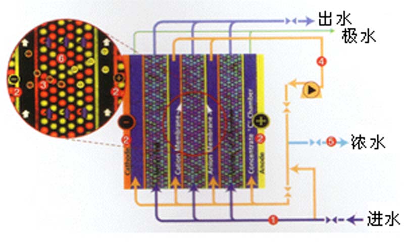 EDI技術簡介 (Electrodeionization)又稱連續(xù)電除鹽技術,它科學地將電滲析技術和離子交換技術融為一體,通過陽、陰離子膜對陽、陰離子的選擇透過作用以及離子交換樹脂對水中離子的交換作用,在電場的作用下實現(xiàn)水中離子的定向遷移,從而達到水的深度凈化除鹽,并通過水電解產生的氫離子和氫氧根離子對裝填樹脂進行連續(xù)再生,因此EDI制水過程不需酸、堿化學藥品再生即可連續(xù)制取高品質超純水,它具有技術先進、結構緊湊、操作簡便的優(yōu)點,可廣泛應用于電力、電子、醫(yī)藥、化工、食品和實驗室領域,是水處理技術的綠色革命。這一新技術可以代替?zhèn)鹘y(tǒng)的離子交換裝置,生產出電阻率高達16-18MΩ·CM的超純水。