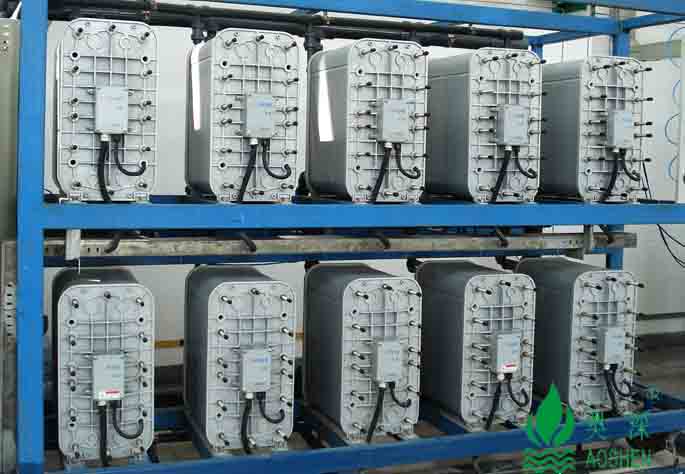 EDI裝置將離子交換樹脂充夾在陰/陽離子交換膜之間形成EDI單元。EDI工作原理如圖所示。 EDI組件中將一定數(shù)量的EDI單元間用網狀物隔開,形成濃水室。又在單元組兩端設置陰/陽電極。在直流電的推動下,通過淡水室水流中的陰陽離子分別穿過陰陽離子交換膜進入到濃水室而在淡水室中去除。而通過濃水室的水將離子帶出系統(tǒng),成為濃水。EDI設備一般以反滲透(RO)純水作為EDI給水。RO純水電阻率一般是40-2μS/cm(25℃)。EDI純水電阻率可以高達18 MΩ.cm(25℃),但是根據(jù)去離子水用途和系統(tǒng)配置設置,EDI純水適用于制備電阻率要求在1-18.2MΩ.cm(25℃)的純水。 高純度水對許多工商業(yè)工程非常重要,比如:半導體制造業(yè)和制藥業(yè)。以前這些工業(yè)用的純凈水是用離子交換獲得的。然而,膜系統(tǒng)和膜處理過程作為預處理過程或離子交換系統(tǒng)的替代品越來越流行。如電除鹽過程(EDI)之類的膜系統(tǒng)可以很干凈地去除礦物質并可以連續(xù)工作。而且,膜處理過程在機械上比離子交換系統(tǒng)簡單得多,并不需要酸、堿再生及廢水中和。EDI處理過程是膜處理過程中增長最快的業(yè)務之一。EDI帶有特殊水槽,水槽里的液流通道中填充了混床離子交換樹脂。EDI主要用于把總固體溶解量(TDS)為1-20mg/L的水源制成8-17兆歐純凈水。 二、EDI模塊結構特點 1、淡水隔板采用衛(wèi)生級PE材料 2、EDI膜片采用進口均相膜和國產異相離子交換膜 3、采用進口EDI專用均粒樹脂和國產EDI專用均粒樹脂 4、EDI電極板采用鈦鍍釕技術 5、壓緊板采用具有硬性的合金鋁軋鑄而成。 6、固定螺絲采用國標標準件 7、膜堆出廠最高試壓7bar不漏水 8、膜堆電阻低、功耗小 9、外觀裝飾板造型美觀結實 10、最大膜堆處理水量3T/H,最小模堆處理水量75L/H 11、純水、濃水、極水通道設計合理,不易堵塞,水流分布均勻、無死角。 三、EDI模塊進水條件