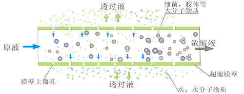 超濾是一種不對稱半透過薄膜,常用材料有醋酸纖維素膜(CA)、聚砜膜(PS)、聚丙烯膜(PAN)等。在一定的壓力下,水在膜表面上流動,水與溶解鹽和其它電解質等微小顆粒能透過超濾膜,而蛋白質、各類酶、細菌、病毒、乳膠、熱源與其它分子量大的顆粒和膠體物質被超濾膜阻擋,從而使水中的部分微粒得到分離、濃縮。超濾膜孔徑為 0.1-0.002µm ,介于反滲透與微孔膜之間。 超濾裝置是根據生產的要求,采用相應截留分子量的超濾膜進行工藝流程設計。超濾分離在常溫、低壓下運行無相態變化,膜不易阻塞,操作極為方便。