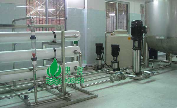 ●源水(箱)→源水泵→機械過濾器→活性炭過濾器→軟水器(根據水的硬度來選用)→精密過濾器→高壓泵→反滲透裝置→中間水箱→陰陽離子混合床→紫外線殺菌器→微孔過濾器→用水點